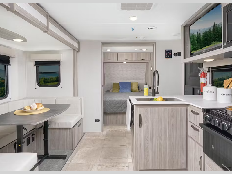 Sleeps 6 Slides 1 Interior Color Sandstone Fresh Water Capacity 54 gals Grey Water Capacity 60 gals Black Water Capacity 30 gals Available Beds Queen Refrigerator Type Double Door 12V Refrigerator Size 10 cu ft Cooktop Burners 3 Number of Awnings 1 LP Tank Capacity 20 lbs Water Heater Type Girard Tankless AC BTU 13500 btu Awning Info 19' Axle Count 2 Number of LP Tanks 2 Shower Type Standard Similar Floorplans