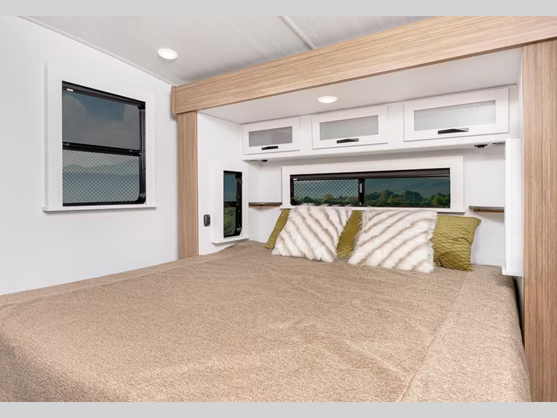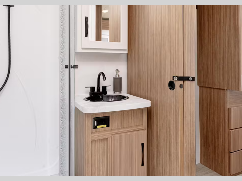 Each one is constructed with a seamless, laminated and gel-coated filon exterior, a fully walkable roof, and a high impact thermoset resin painted front cap for added protection. You'll love the residential and durable Beauflor vinyl flooring inside, along with Frosted Cedar woodgrain cabinetry and deluxe night shades. The exterior is just as accommodating with its outside shower, Edge View line lighting in the front and rear, plus power stabilizer jacks to name a few conveniences.